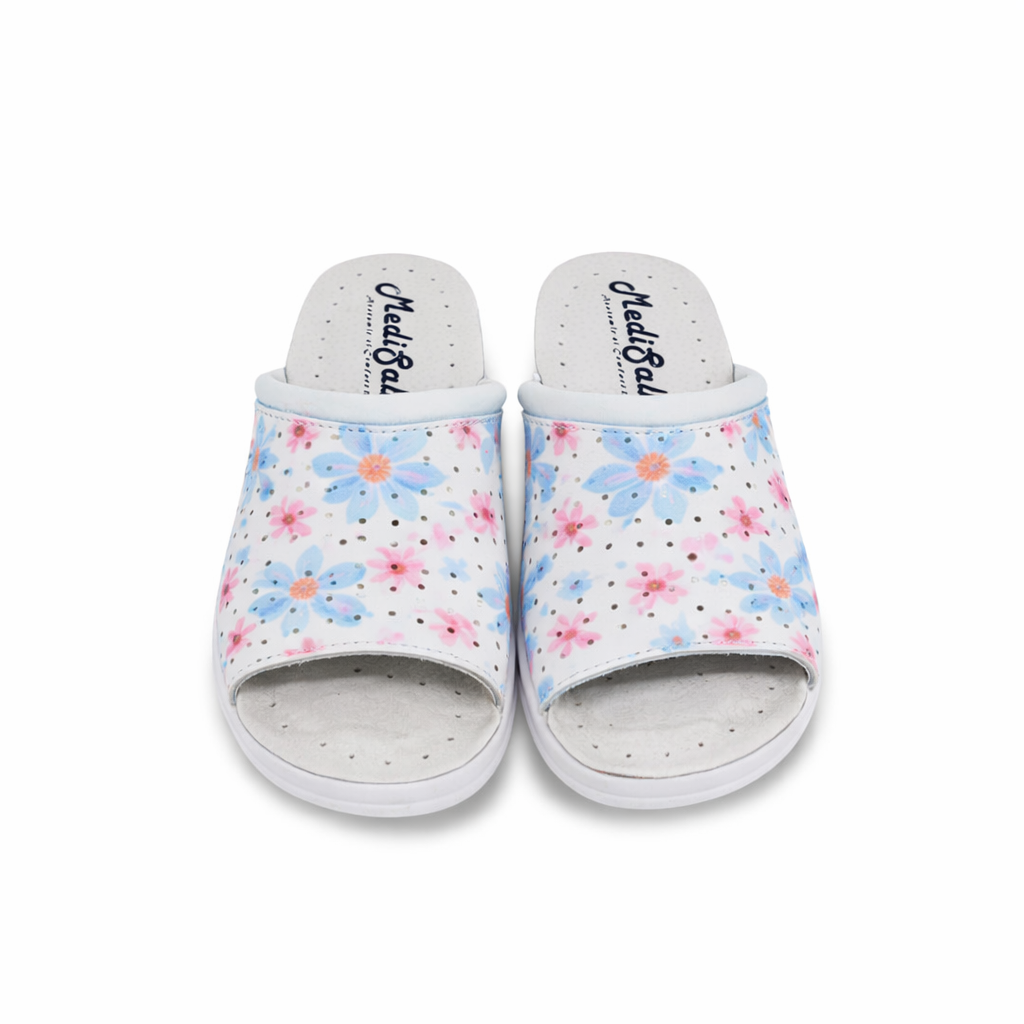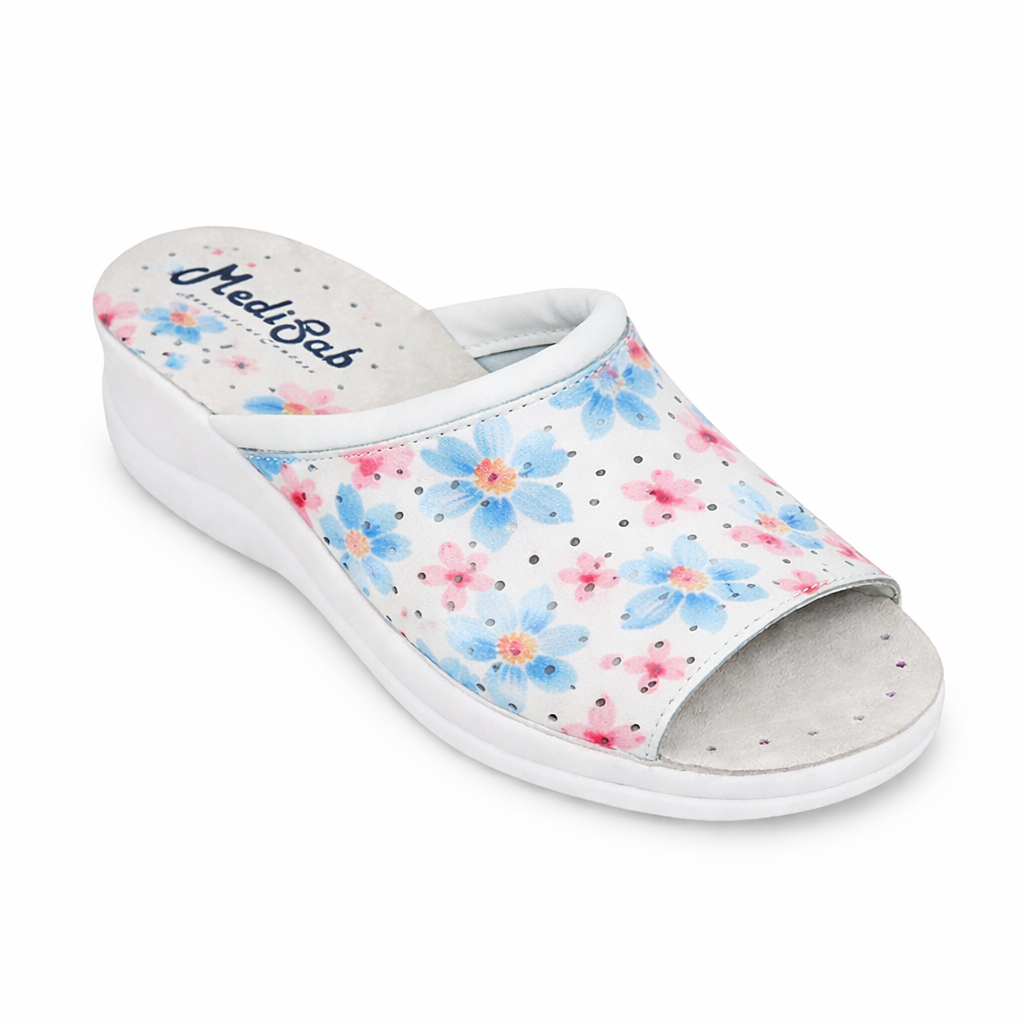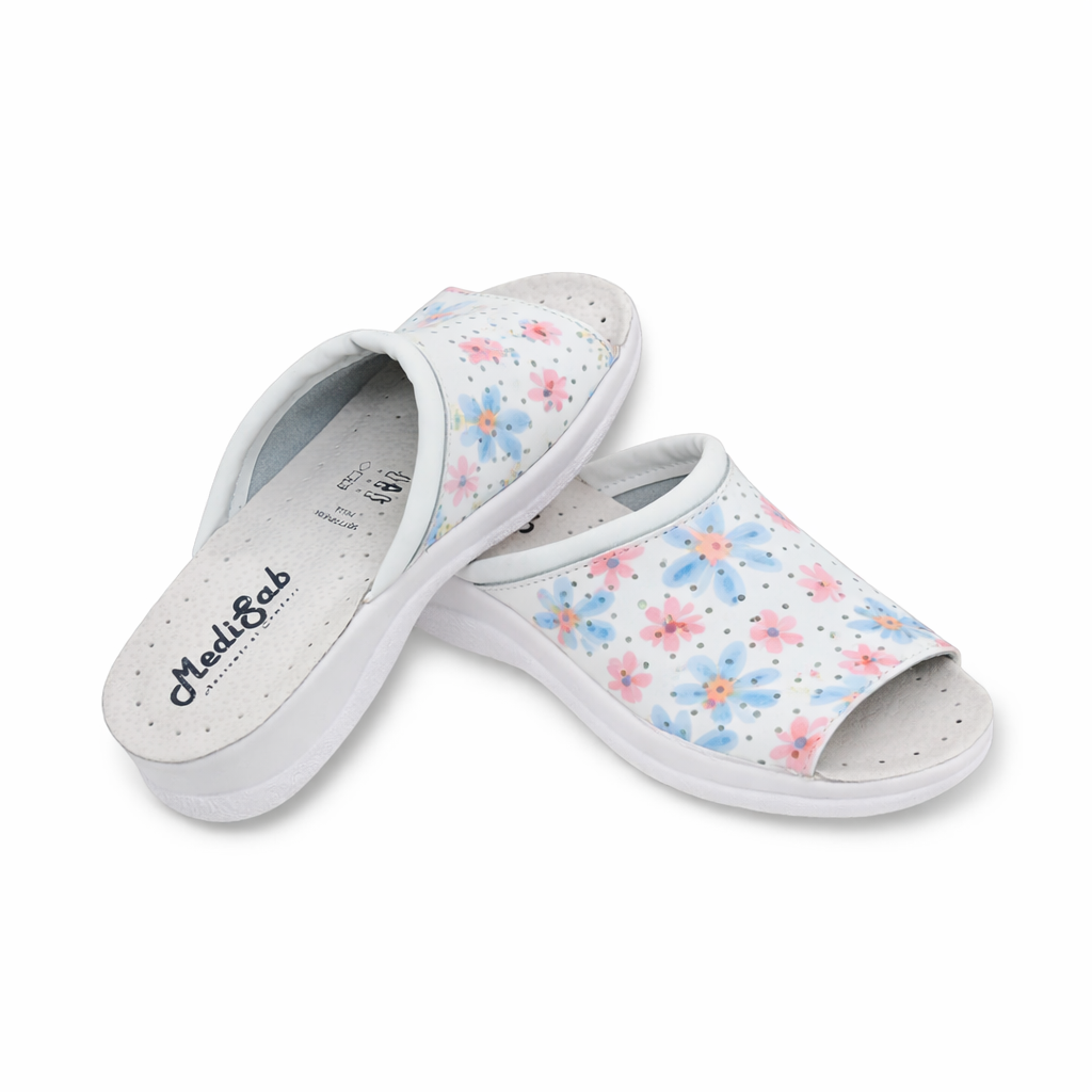 Concepuți pentru confort absolut, acești papuci mențin picioarele relaxate și detensionate pe durata întregii zile. Atenuează presiunea asupra tălpilor, gleznelor, genunchilor și zonei lombare, oferind o susținere sigură și plăcută chiar și în timpul purtării îndelungate. Sunt extrem de ușori, flexibili și foarte comozi, astfel încât piciorul se așază natural fără presiune sau disconfort. Designul deschis în față permite degetelor să stea relaxate și aerisite, prevenind senzația de strângere. Talpa moale și suportul ergonomic reduc oboseala picioarelor, fiind ideali pentru purtare îndelungată, atât la muncă, cât și acasă. În plus, imprimeul vesel cu floricele adaugă un plus de stil și personalitate.