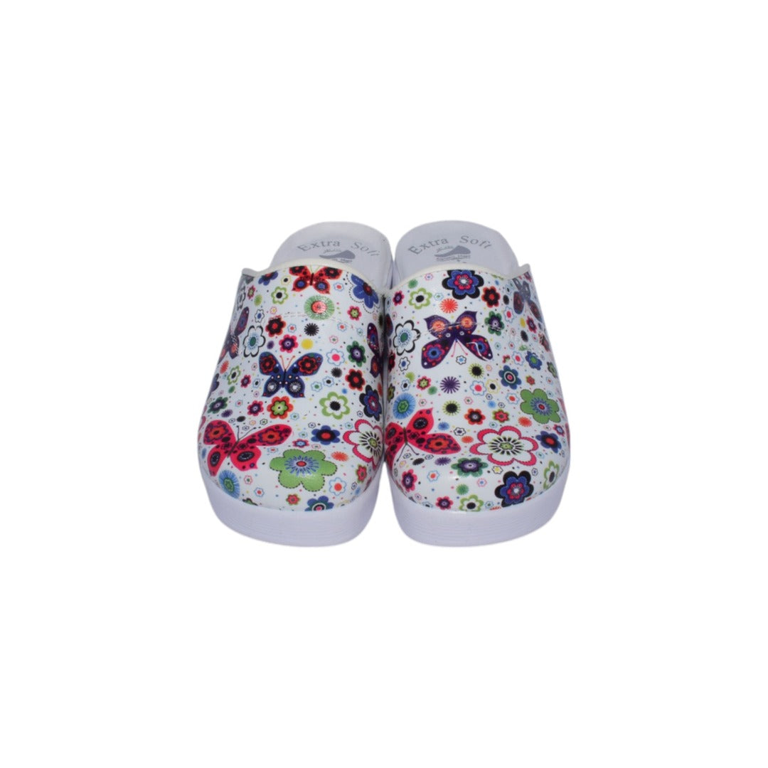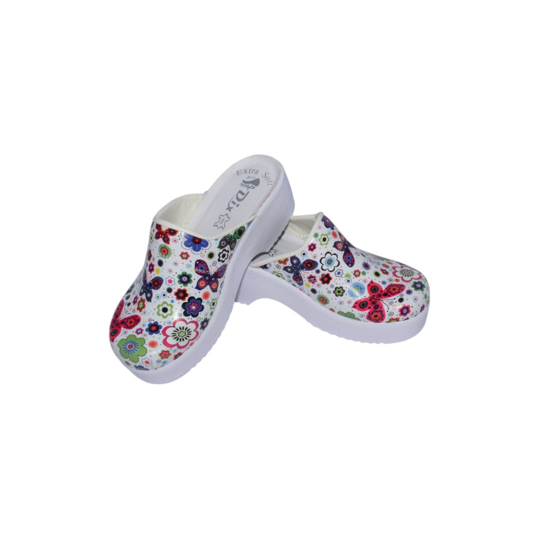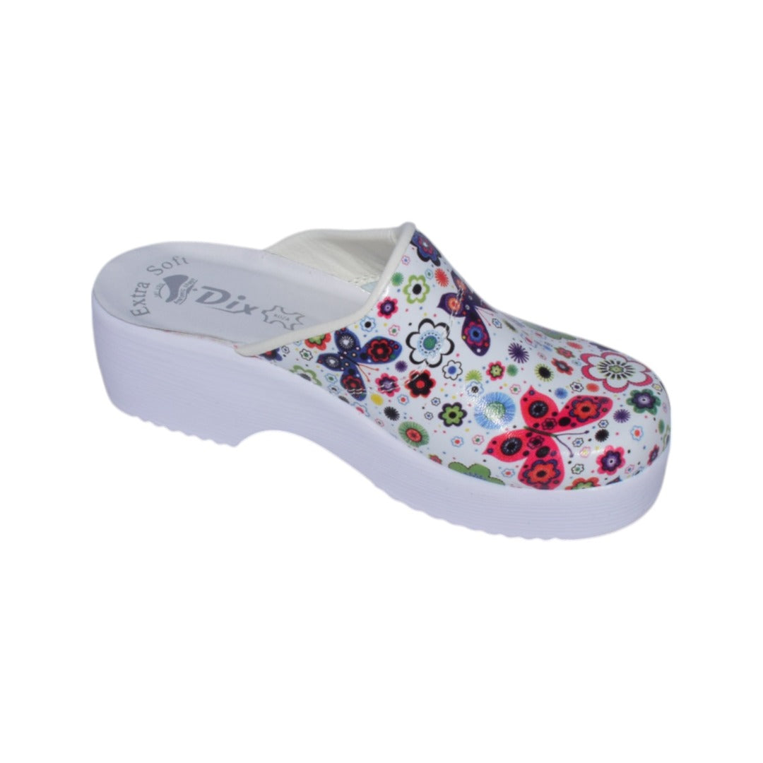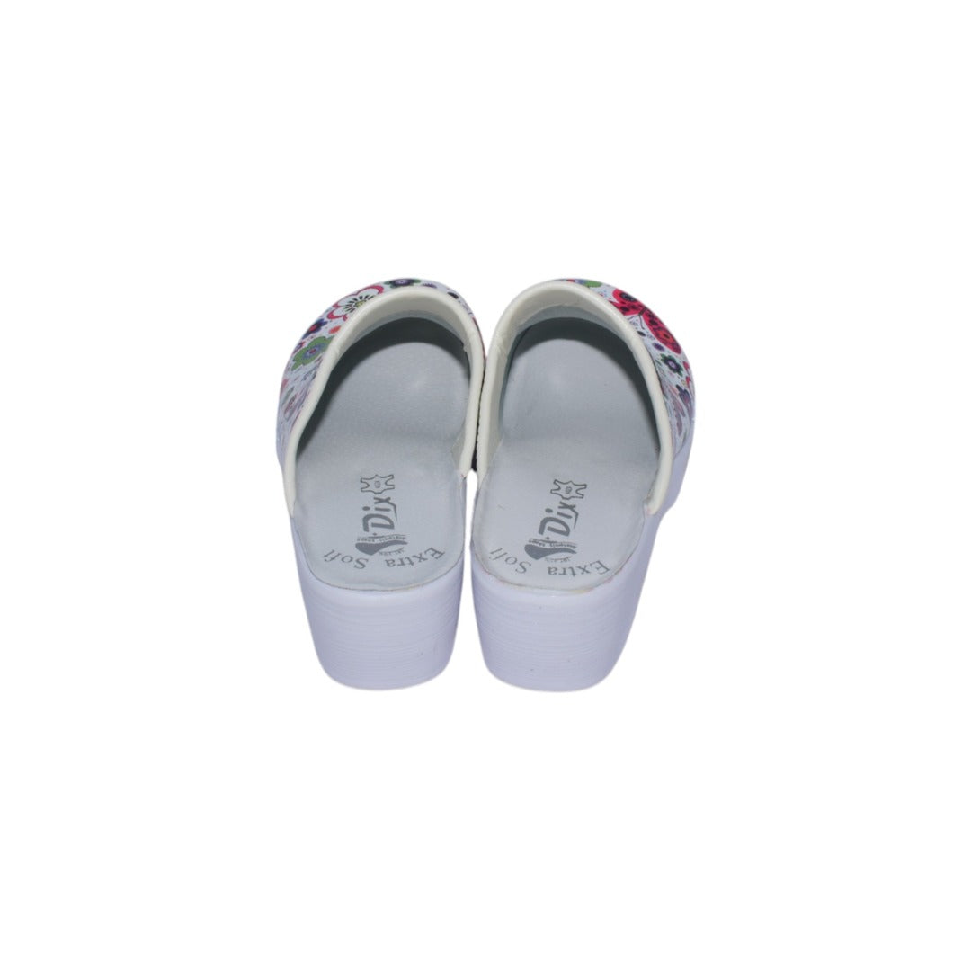 Acest sabot medical combină confort și stil, oferind un design floral delicat pe un material ușor și durabil din piele tratată. Platforma robustă, albă, asigură stabilitatea și o excelentă pe toate zilele. Interiorul este prevăzut cu un strat de burete cu memorie, care se adaptează formei piciorului pentru un confort optim. Talpa este dotată cu inserții verzi anti-alunecare, asigurând aderență superioară pe diverse suprafețe, ideală pentru mediile profesionale .