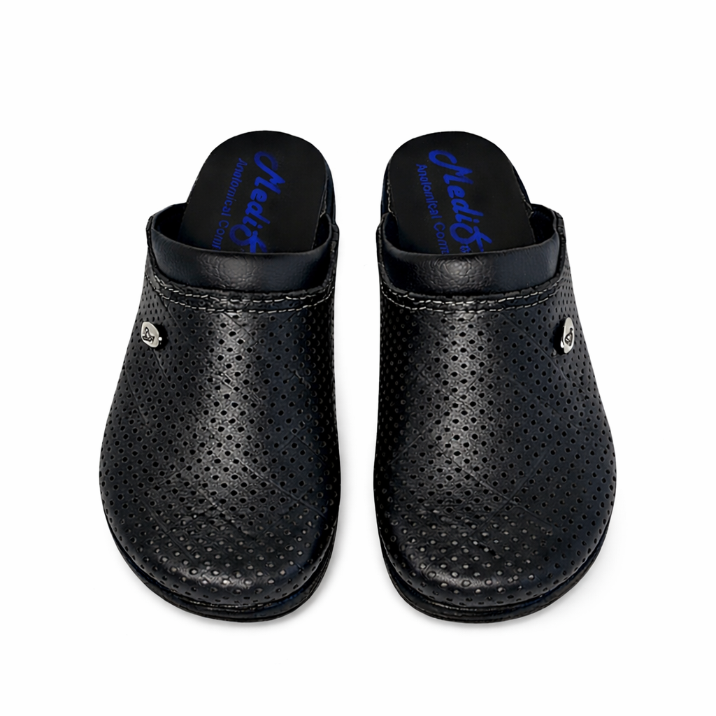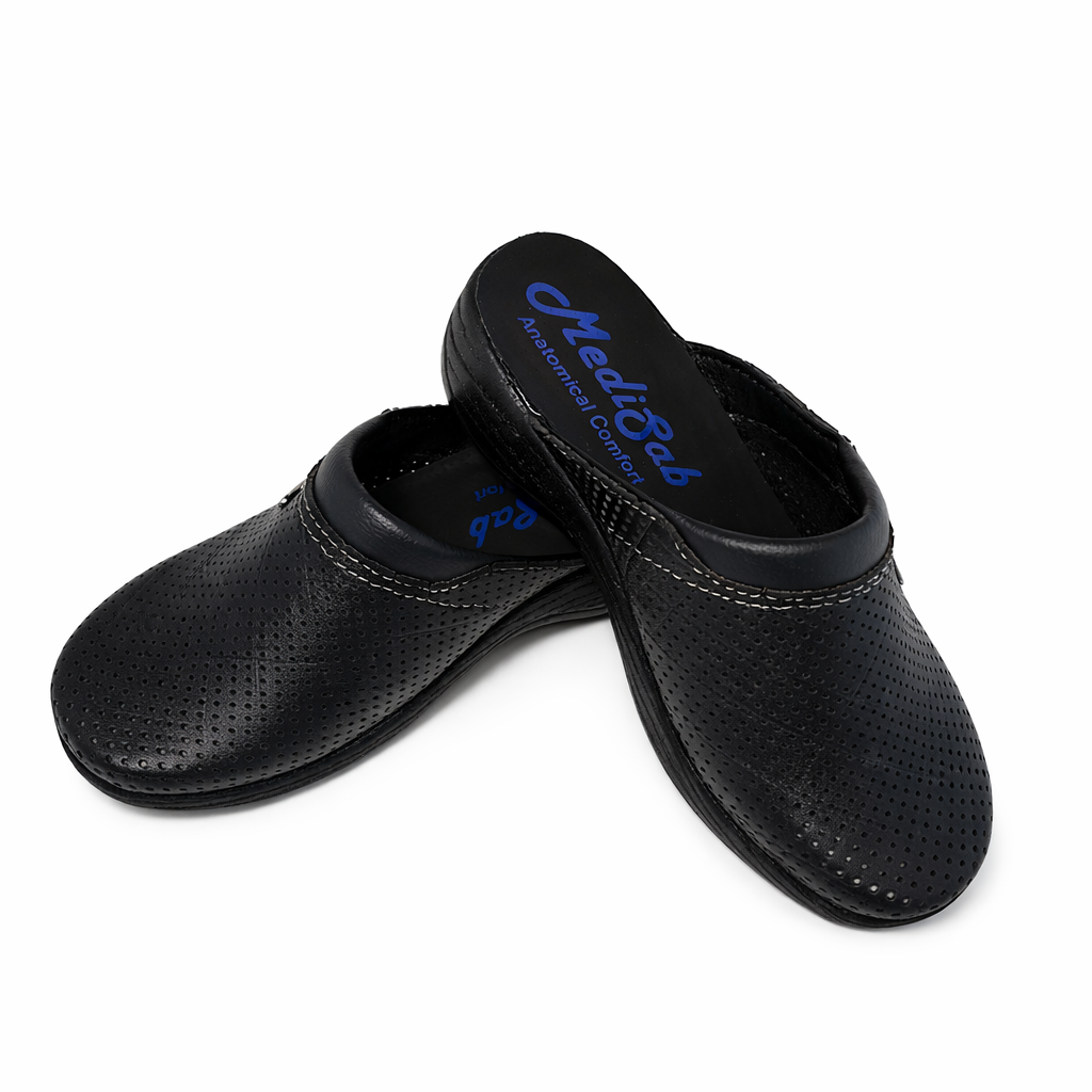 Sabotii medicali damă Medisab din piele porc perforată fabricati in Serbia ,oferă confort anatomic și susținere optimă pentru persoanele care petrec multe ore în picioare. Concepuți pentru utilizare zilnică, aceștia reduc oboseala picioarelor și asigură stabilitate pe durata întregii zile de lucru.